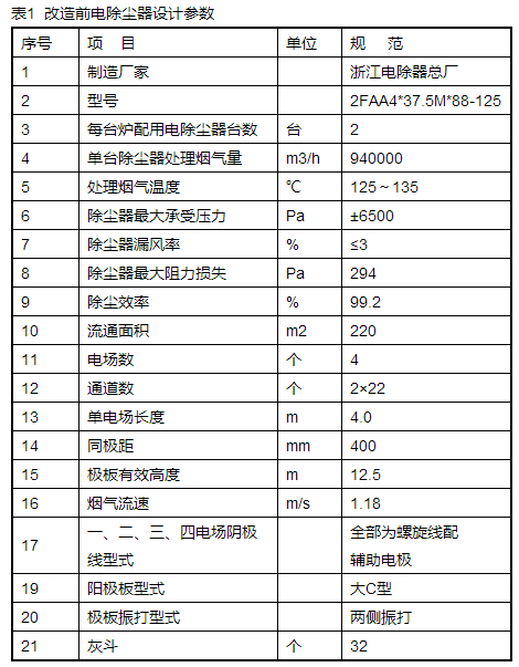改造前,本工程配套兩臺(tái)浙江電除塵器總廠(即現(xiàn)在菲達(dá)環(huán)保)生產(chǎn)的2FAA4*37.5M*88-125型雙室四電場(chǎng)臥式除塵器,電除塵控制部份采用福建龍巖空氣凈化設(shè)備廠生產(chǎn)的GGAF02-1.0/72H型產(chǎn)品,設(shè)計(jì)除塵效率≥99.2%,極板型式為大C型板,極線型式為全部為螺旋線配輔助電極,出口設(shè)槽極板,振打方式全部采用側(cè)部饒臂錘振打。其一、二、三、四電場(chǎng)高壓供電和控制裝置是GGAJ02-1.0/72CG型的整流變壓器。本工程改造前電除塵器設(shè)計(jì)參數(shù)見表1。